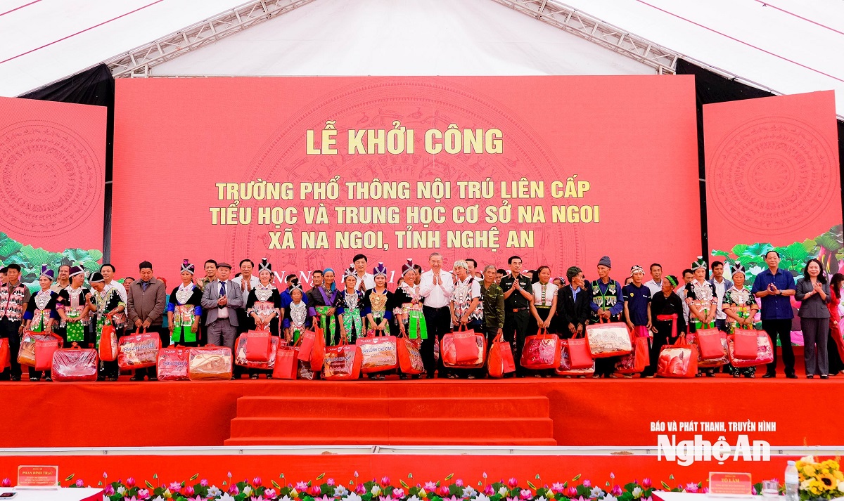 Phát biểu tại buổi lễ, Tổng Bí thư Tô Lâm bày tỏ niềm vui mừng khi được về thăm đồng bào các dân tộc vùng biên giới Nghệ An để dự Lễ khởi công xây dựng Trường liên cấp xã Na Ngoi. Đây là một công trình mang ý nghĩa đặc biệt quan trọng, thể hiện sự quan tâm sâu sắc của Đảng, Nhà nước và Chính phủ đối với sự nghiệp giáo dục, nhất là ở vùng sâu, vùng xa, vùng đồng bào dân tộc thiểu số và biên giới.