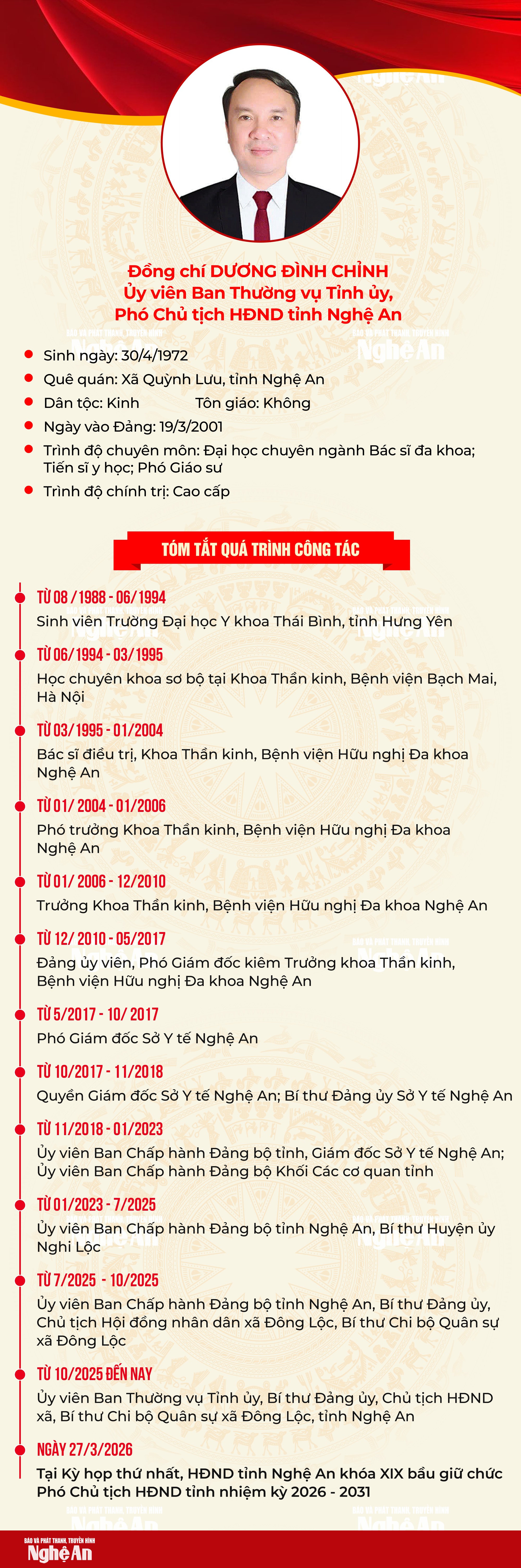 Chiều 27/3, tại Kỳ họp thứ Nhất, HĐND tỉnh Nghệ An khóa XIX đã bầu đồng chí Dương Đình Chỉnh - Ủy viên Ban Thường vụ Tỉnh ủy, Bí thư Đảng ủy, Chủ tịch HĐND xã Đông Lộc giữ chức vụ Phó Chủ tịch HĐND tỉnh nhiệm kỳ 2026 - 2031.