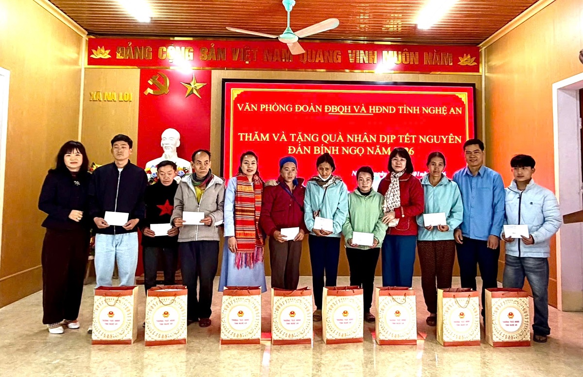 Nhân dịp này, đoàn công tác đã trao 25 suất quà, mỗi suất trị giá 1,2 triệu đồng (bao gồm 1 triệu đồng tiền mặt và 01 túi quà) cho 20 hộ gia đình có hoàn cảnh đặc biệt khó khăn và 05 học sinh nghèo vượt khó do Văn phòng nhận nuôi dưỡng, giúp đỡ; đồng thời thăm hỏi, chúc Tết Đảng ủy, HĐND, UBND, UBMTTQ Việt Nam xã và Công an xã Na Loi.