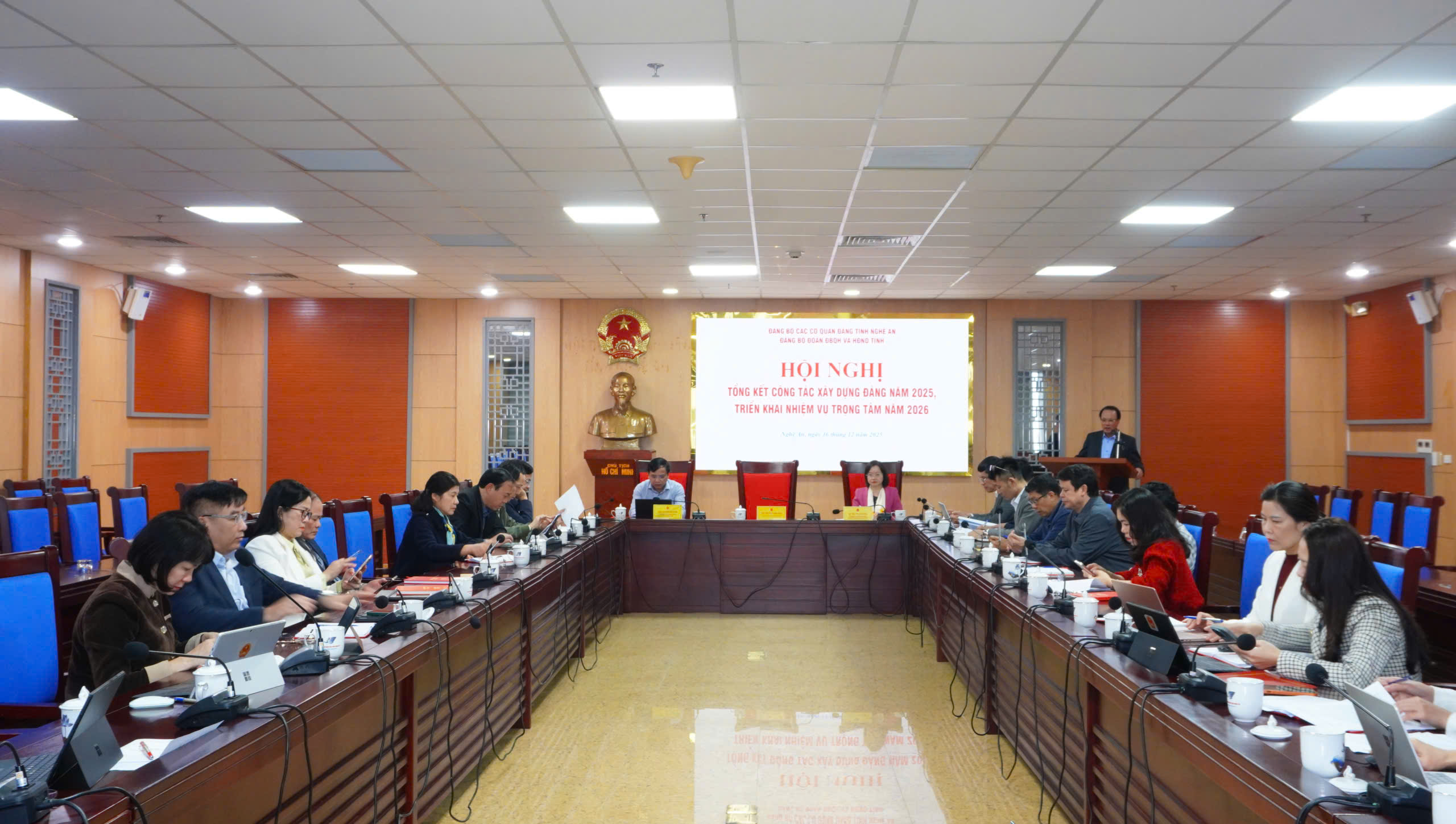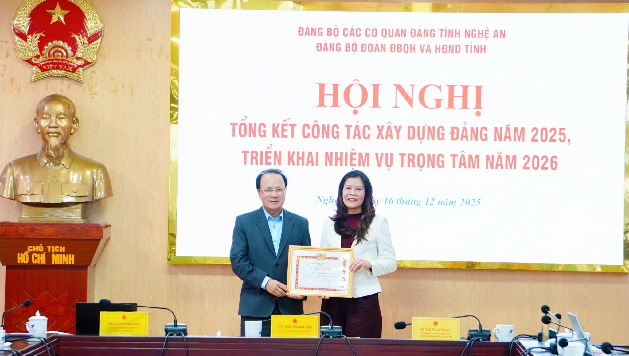 Chủ trì Hội nghị có các đồng chí: Nguyễn Nam Đình, Phó Chủ tịch Thường trực HĐND tỉnh, Uỷ viên Ban Thường vụ, Chủ nhiệm UBKT Đảng uỷ các cơ quan Đảng tỉnh, Bí thư Đảng uỷ Đoàn ĐBQH và HĐND tỉnh; Nguyễn Như Khôi, Uỷ viên BCH Đảng bộ tỉnh, Phó Chủ tịch HĐND tỉnh, Phó Bí thư Thường trực Đảng uỷ; Thái Thị An Chung, Uỷ viên BCH Đảng bộ tỉnh, Phó Trưởng Đoàn ĐBQH tỉnh, Phó Bí thư Đảng uỷ.