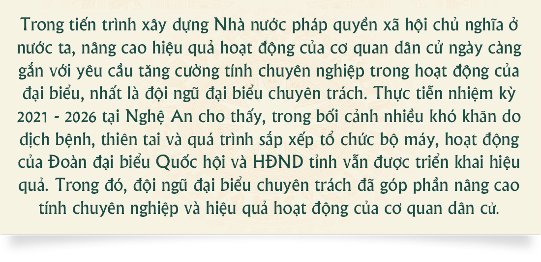 Phát huy vai trò của đội ngũ đại biểu chuyên trách trong nghiên cứu, thẩm tra, giám sát và kết nối tiếng nói cử tri với các quyết sách của cơ quan dân cử sẽ tiếp tục là yếu tố quan trọng để nâng cao hiệu lực, hiệu quả hoạt động của Đoàn ĐBQH và HĐND tỉnh. Đây cũng là nền tảng để cơ quan dân cử thực hiện tốt chức năng đại diện cho ý chí, nguyện vọng của Nhân dân, góp phần vào mục tiêu phát triển nhanh và bền vững của tỉnh Nghệ An trong giai đoạn mới.