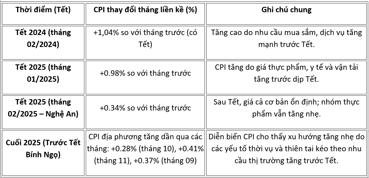 Ghi chú biểu đồ: Các số liệu CPI qua các tháng quanh dịp Tết thể hiện xu hướng giá tiêu dùng có dao động nhưng không biến động quá lớn, điều này phản ánh phần nào hiệu quả của các giải pháp bình ổn thị trường và nguồn cung hàng hoá.