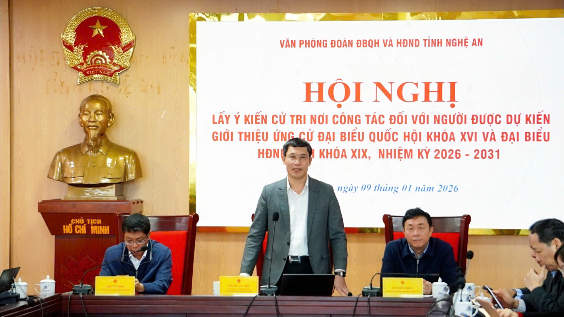 Đồng chí Nguyễn Thị Thu, Thư ký Hội nghị, trình bày danh sách dự kiến giới thiệu người ứng cử đại biểu Quốc hội khóa XVI và đại biểu HĐND tỉnh khóa XIX nhiệm kỳ 2026–2031. Theo phân bổ về cơ cấu, thành phần người ứng cử, Văn phòng Đoàn ĐBQH và HĐND tỉnh dự kiến giới thiệu 7 người ứng cử đại biểu Quốc hội khóa XVI; dự kiến giới thiệu 18 người ứng cử đại biểu HĐND tỉnh khóa XIX. Hội nghị cũng nghe tóm tắt tiểu sử của các cá nhân được dự kiến giới thiệu ứng cử.