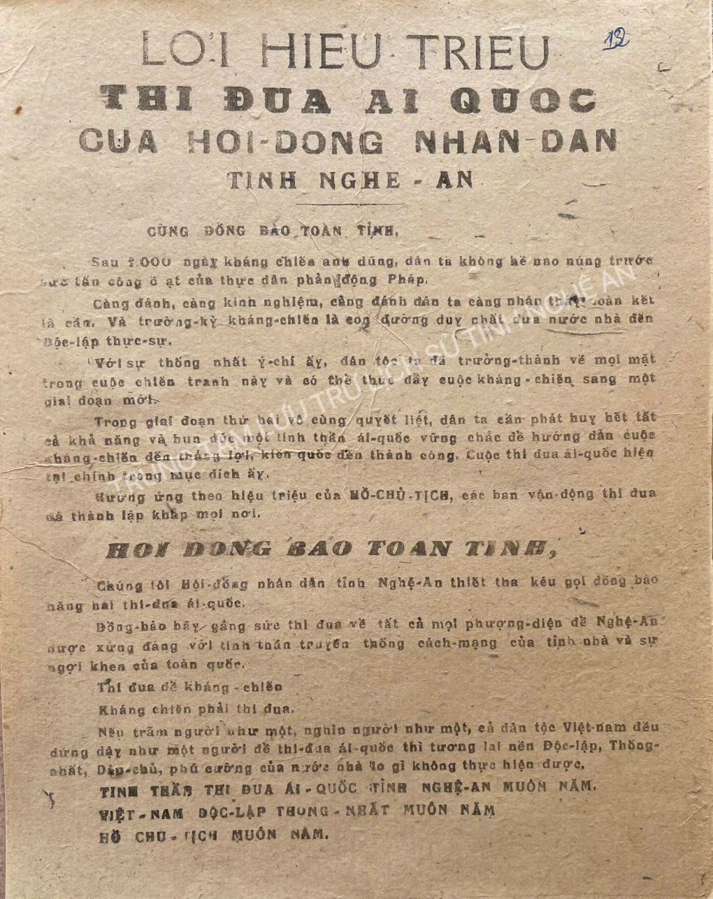 Hưởng ứng lời kêu gọi thi đua ái quốc của Chủ tịch Hồ Chí Minh, Hội đồng nhân dân tỉnh Nghệ An tha thiết hiệu triệu toàn thể đồng bào: