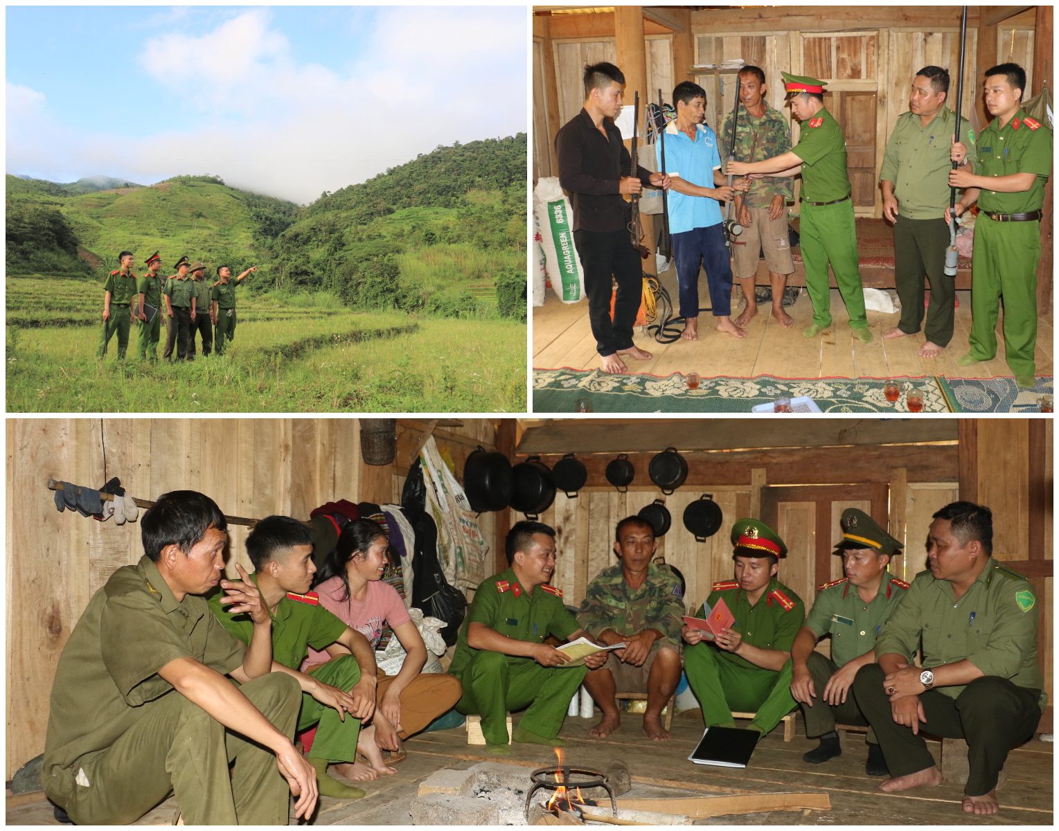 Một buổi tuần tra của lực lượng Công an xã Tri Lễ; Người dân xã Tri Lễ giao nộp vũ khí cho lực lượng công an xã; Công an xã Tri Lễ đến tận nơi tuyên truyền phổ biến pháp luật cho người dân. Ảnh tư liệu: Trọng Tuấn.
