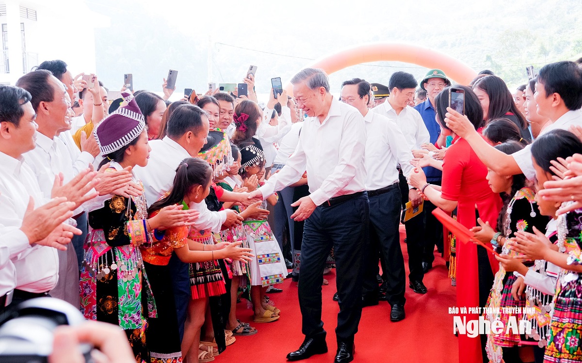 Tổng Bí thư Tô Lâm nhấn mạnh, các em học sinh ở đây hoàn toàn có thể học hết phổ thông tại quê hương, sau đó tiếp tục học đại học, trở thành kỹ sư, bác sĩ, sĩ quan, công nhân, nông dân, người lao động. Vì vậy, việc đầu tiên là phải có trường lớp. Bộ Chính trị đã có nghị quyết và chủ trương ưu tiên cho các xã vùng biên giới, nơi điều kiện sinh hoạt còn nhiều khó khăn. Tổng Bí thư hoan nghênh tỉnh Nghệ An đã sớm có nhiều chủ trương, chính sách chăm lo cho đồng bào vùng biên giới.