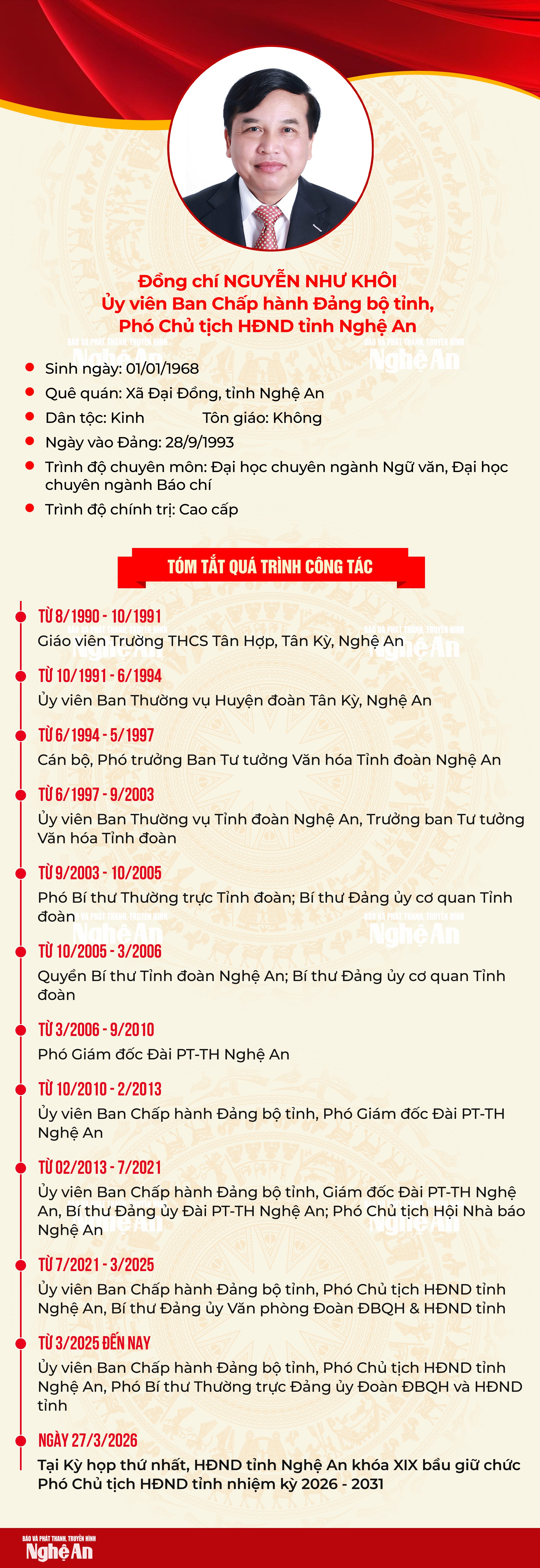 Chiều 27/3, tại Kỳ họp thứ Nhất, HĐND tỉnh Nghệ An khóa XIX đã bầu đồng chí Nguyễn Như Khôi - Ủy viên Ban Chấp hành Đảng bộ tỉnh giữ chức vụ Phó Chủ tịch HĐND tỉnh nhiệm kỳ 2026 - 2031.