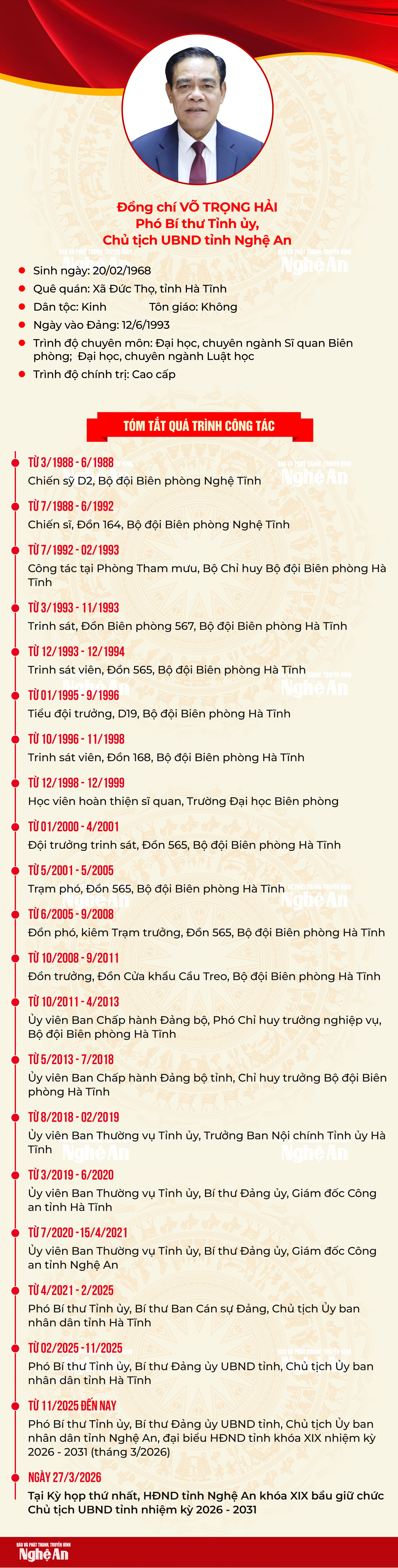 Chiều 27/3, tại Kỳ họp thứ Nhất, HĐND tỉnh Nghệ An khóa XIX đã bầu đồng chí Võ Trọng Hải - Phó Bí thư Tỉnh ủy giữ chức vụ Chủ tịch UBND tỉnh nhiệm kỳ 2026 - 2031.