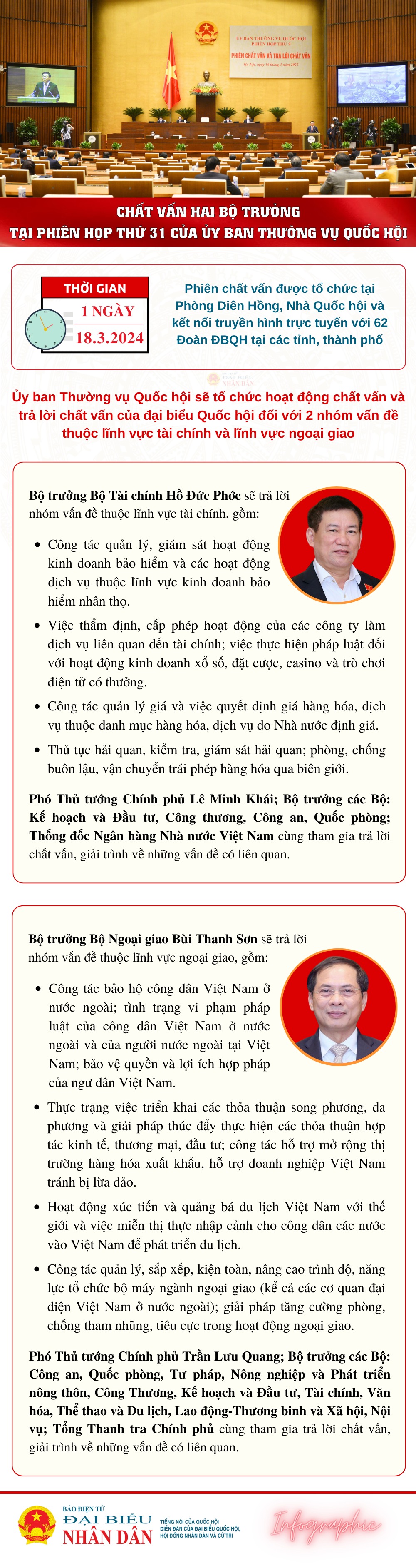 Phiên họp thứ 31 của Ủy ban Thường vụ Quốc hội sẽ diễn ra trong 3,5 ngày (từ ngày 14-19.3). Trong khuôn khổ phiên họp, Ủy ban Thường vụ Quốc hội tổ chức hoạt động chất vấn đối với Bộ trưởng Bộ Tài chính Hồ Đức Phớc và Bộ trưởng Bộ Ngoại giao Bùi Thanh Sơn.