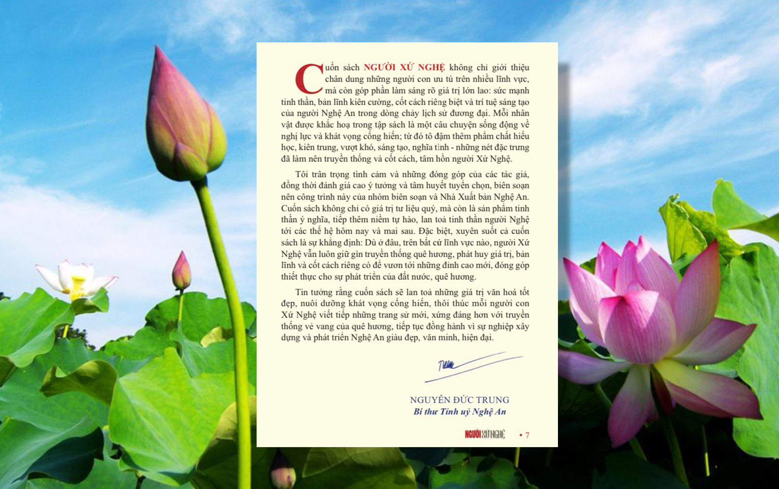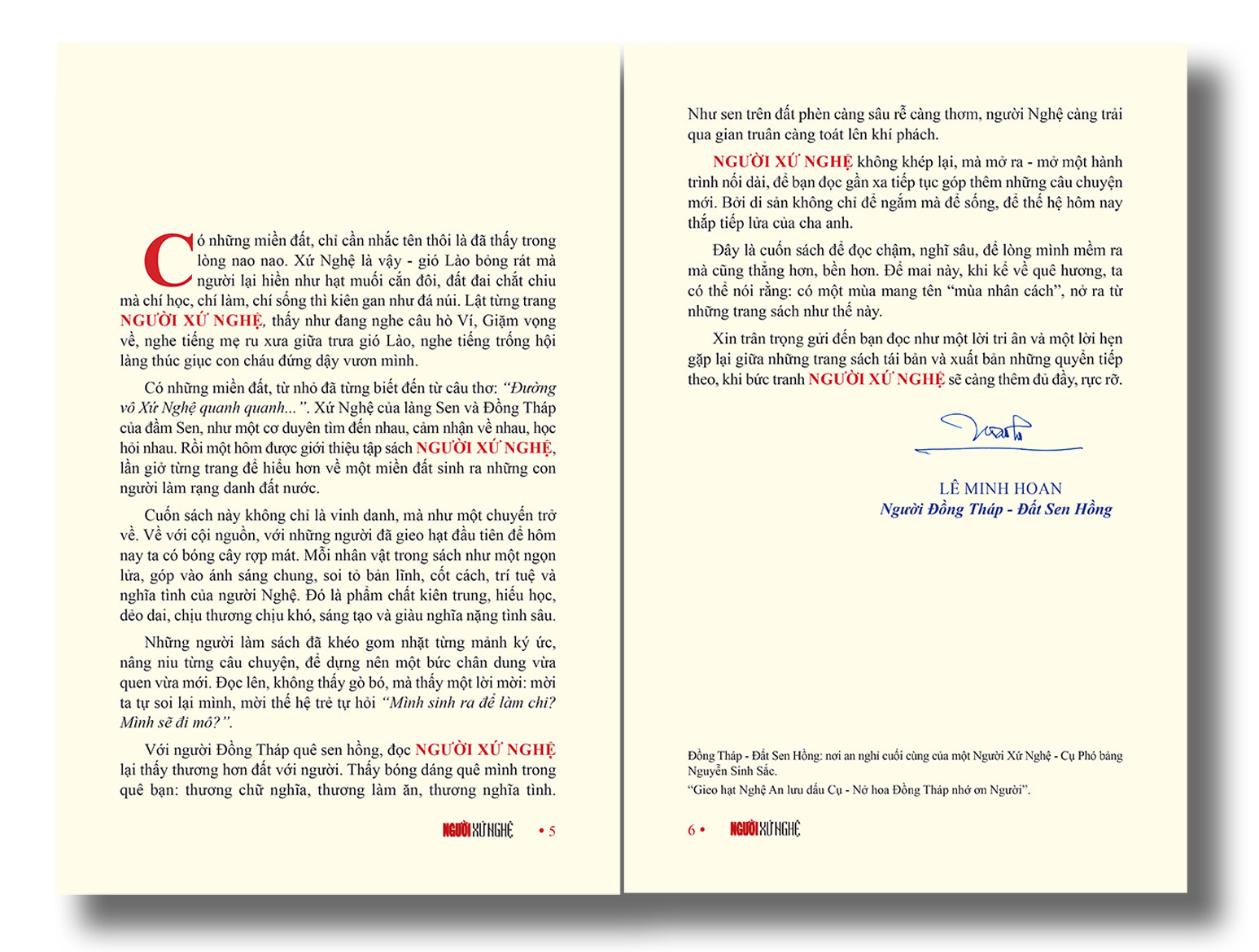 Cuốn sách “Người Xứ Nghệ” chắc chắn sẽ níu giữ bạn một lần nữa quay lại lời mở đầu, sau khi khép lại trang cuối, vì những dòng gửi gắm vô cùng thấm thía của Phó Chủ tịch Quốc hội Lê Minh Hoan: “Đây là cuốn sách để đọc chậm, nghĩ sâu, để lòng mình mềm ra mà cũng thẳng hơn, bền hơn. Để mai này khi kể về quê hương, ta có thể nói rằng: có một mùa mang tên “mùa nhân cách”, nở ra từ những trang sách như thế này”.