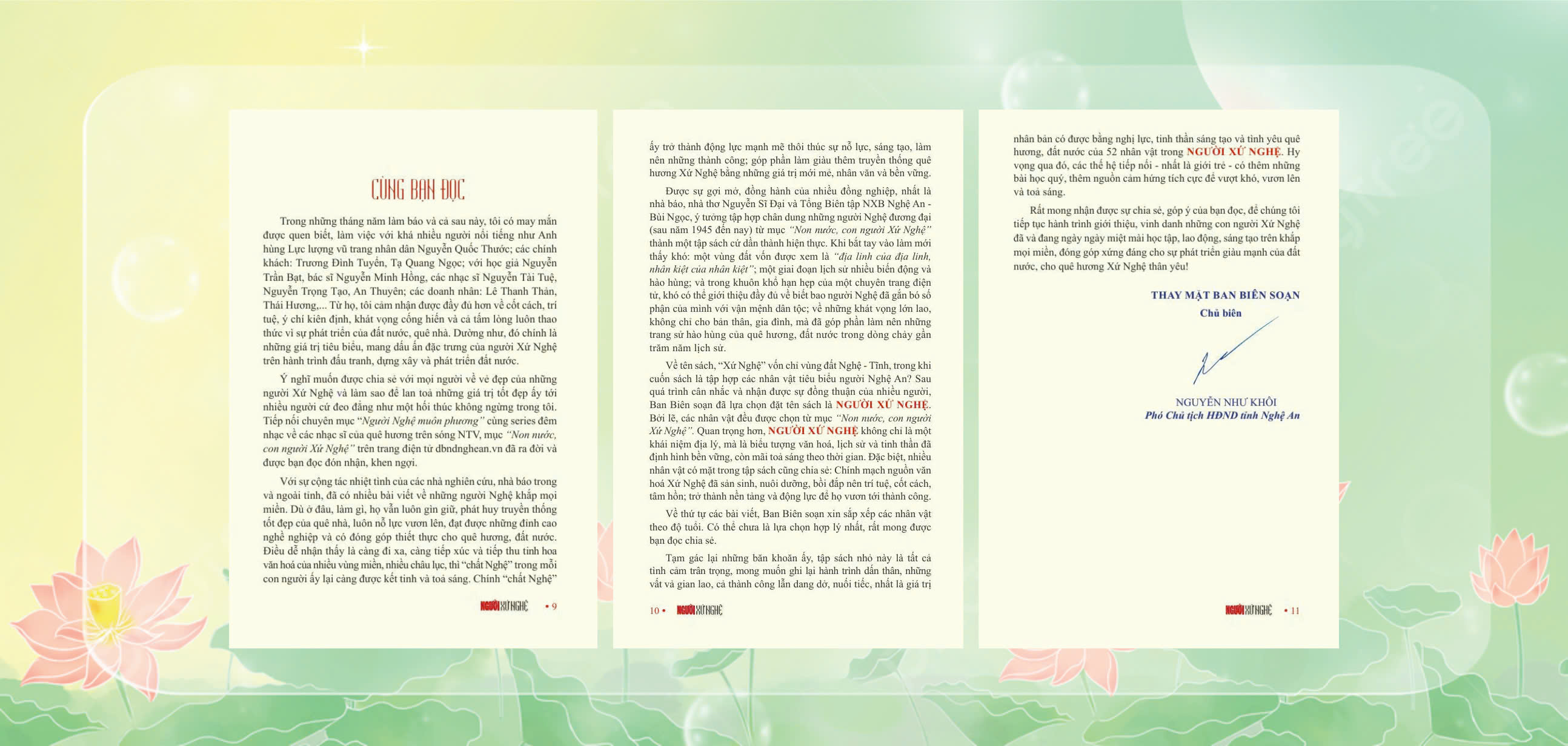 Trước đây, một số chuyên mục trên NTV do nhà báo Nguyễn Như Khôi chỉ đạo thực hiện, cũng như những bài viết trên website dbndnghean.vn, đã phần nào giúp ông thỏa ước nguyện. Và sau này, với sự đồng hành của bè bạn, đồng nghiệp cùng một Ban biên soạn giàu tri thức và tâm huyết, cuốn sách “Người Xứ Nghệ” đã được thai nghén, chắt lọc, và ra đời như một món quà tinh thần quý giá gửi tới bạn đọc trong mùa thu nhiều ý nghĩa này. Câu chuyện của cuốn sách cũng là câu chuyện về sự gặp gỡ đẹp đẽ của những người Nghệ xa quê đau đáu yêu quê, và những người đang một lòng cống hiến trên đất quê. Ngoài nhà báo Nguyễn Như Khôi, là nhà thơ xứ Nghệ kiêu hãnh với lý lịch của mình: “Ông tôi, cha tôi và tôi/ Ba đời làm lính, ba đời nông dân” Nguyễn Sỹ Đại, là nhà văn Bùi Ngọc - người có công đưa thương hiệu “nhà xuất bản Nghệ An” ra với cả nước ở vai trò là Giám đốc, Tổng biên tập.