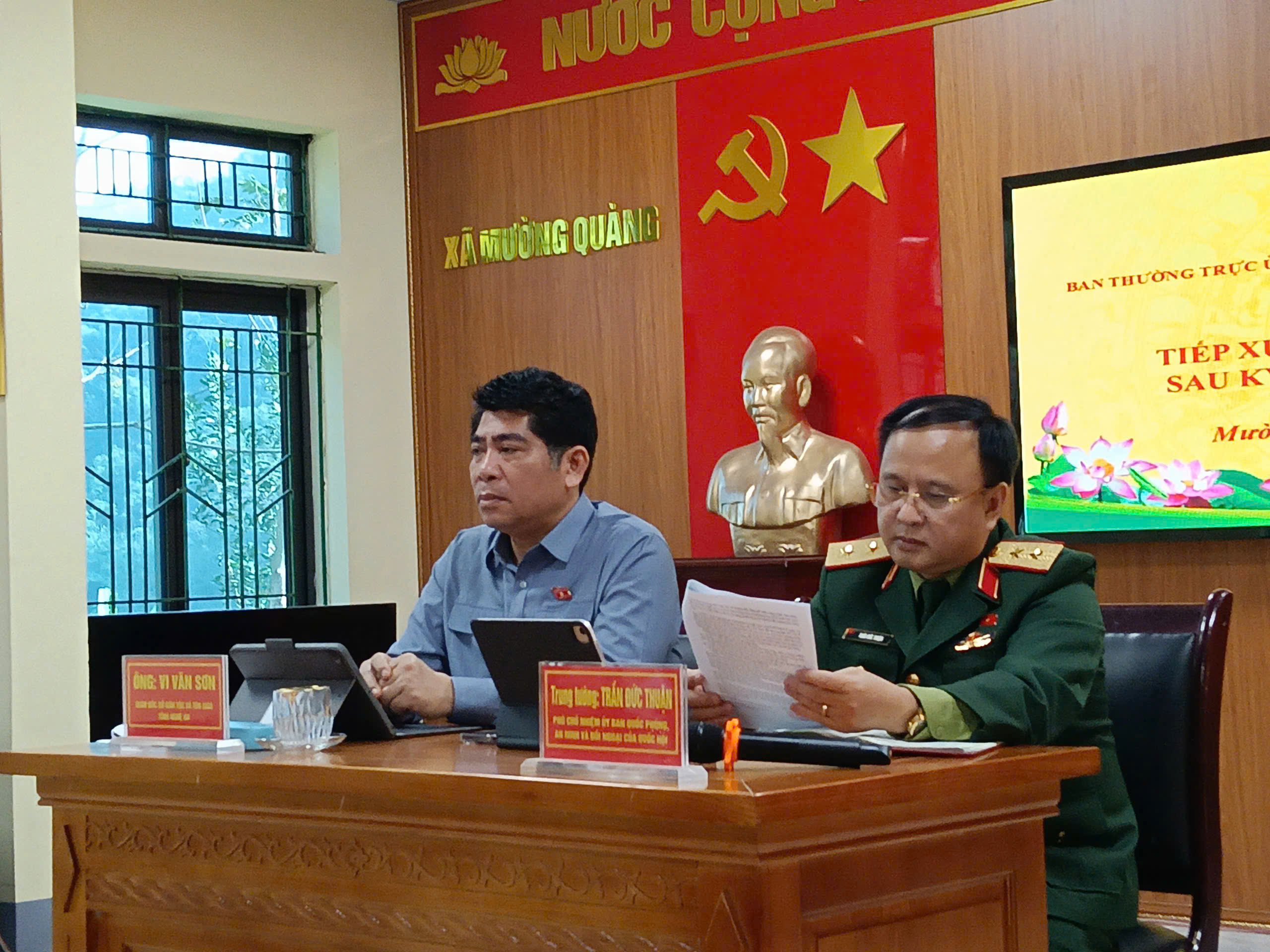 Tham gia hội nghị tiếp xúc cử tri có lãnh đạo và đại diện lãnh đạo các sở: Nội vụ, Nông nghiệp và Môi trường, Xây dựng, cùng đông đảo cử tri xã Mường Quàng.