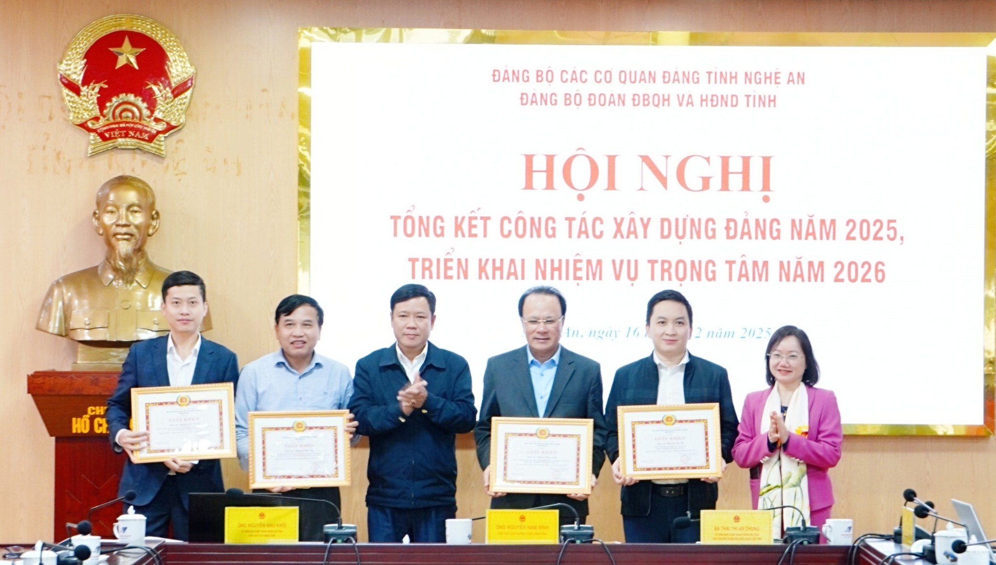 Chủ trì Hội nghị có các đồng chí: Nguyễn Nam Đình, Phó Chủ tịch Thường trực HĐND tỉnh, Uỷ viên Ban Thường vụ, Chủ nhiệm UBKT Đảng uỷ các cơ quan Đảng tỉnh, Bí thư Đảng uỷ Đoàn ĐBQH và HĐND tỉnh; Nguyễn Như Khôi, Uỷ viên BCH Đảng bộ tỉnh, Phó Chủ tịch HĐND tỉnh, Phó Bí thư Thường trực Đảng uỷ; Thái Thị An Chung, Uỷ viên BCH Đảng bộ tỉnh, Phó Trưởng Đoàn ĐBQH tỉnh, Phó Bí thư Đảng uỷ.