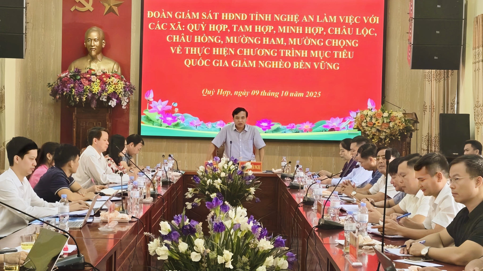 Tiếp tục thực hiện kế hoạch giám sát chuyên đề của HĐND tỉnh về việc thực hiện Chương trình mục tiêu quốc gia giảm nghèo bền vững, ngày 09/10/2025, Đoàn giám sát HĐND tỉnh do đồng chí Nguyễn Như Khôi, Ủy viên Ban Chấp hành Đảng bộ tỉnh, Phó Chủ tịch HĐND tỉnh làm Trưởng Đoàn đã làm việc với các xã Quỳ Hợp, Châu Lộc, Châu Hồng, Tam Hợp, Mường Ham, Mường Chọng, Minh Hợp.
