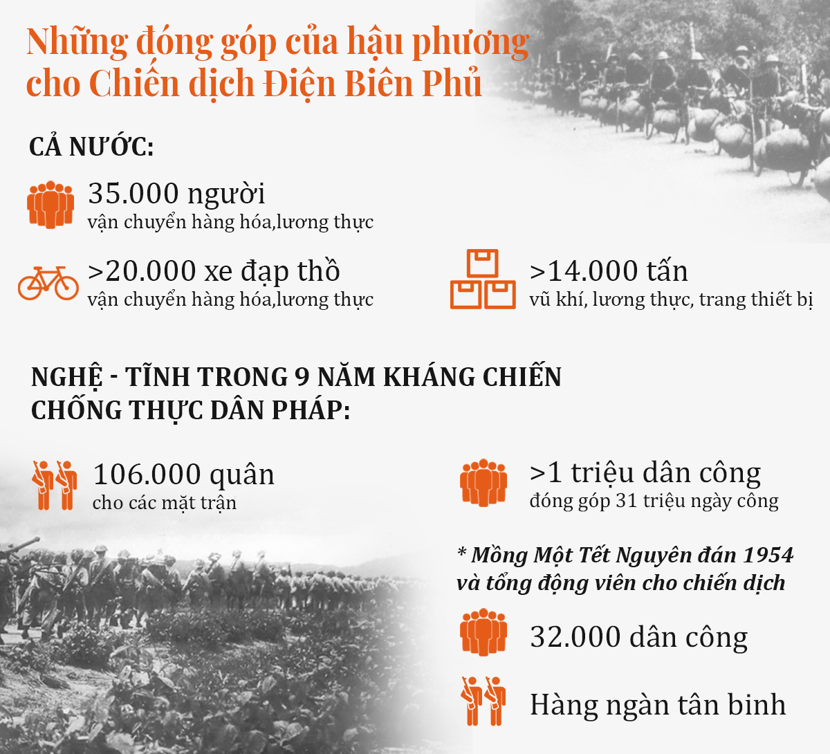 Trong chiến dịch lịch sử Điện Biên Phủ, Việt Nam đã huy động hơn 35 ngàn người vận chuyển, trên 20 nghìn xe đạp thồ để mang lên Điện Biên hơn 14 ngàn tấn vũ khí, lương thực, trang thiết bị. Và Thanh – Nghệ - Tĩnh là 3 địa phương cung cấp người và lương thực, thực phẩm, quân nhu cho chiến dịch lớn nhất cả nước. Không có số liệu chính xác cho từng giai đoạn hay trận đánh vì quá trình bổ sung nhân lực và tiếp viện hàng hóa liên tục, kéo dài. Tiền tuyến cần hậu phương sẵn sàng chi viện. Nhưng trong 9 năm kháng chiến chống thực dân Pháp, Nghệ - Tĩnh đã bổ sung gần 106.000 quân cho các mặt trận, huy động hơn 1 triệu dân công, đóng góp 31 triệu ngày công. Cao điểm ngày mồng Một Tết Nguyên đán 1954 và tổng động viên cho chiến dịch, Nghệ Tĩnh đã điều 32.000 dân công, hàng ngàn tân binh và gần 6000 thanh niên nhập ngũ.