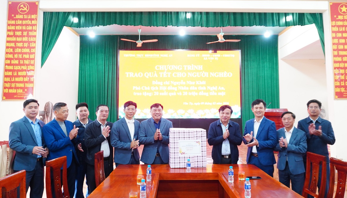 Đồng chí Phó Chủ tịch HĐND tỉnh đã trao tặng 20 suất quà cho các hộ nghèo; mỗi suất quà bao gồm 1 triệu đồng tiền mặt và quà hiện vật trị giá 200.000 đồng. Đồng chí đã trao trực tiếp các suất quà tại xã Vân Du và đề nghị Đảng ủy, Ủy ban Mặt trận Tổ quốc xã Vân Tụ chuyển đến tận tay các hộ gia đình có hoàn cảnh khó khăn trên địa bàn.