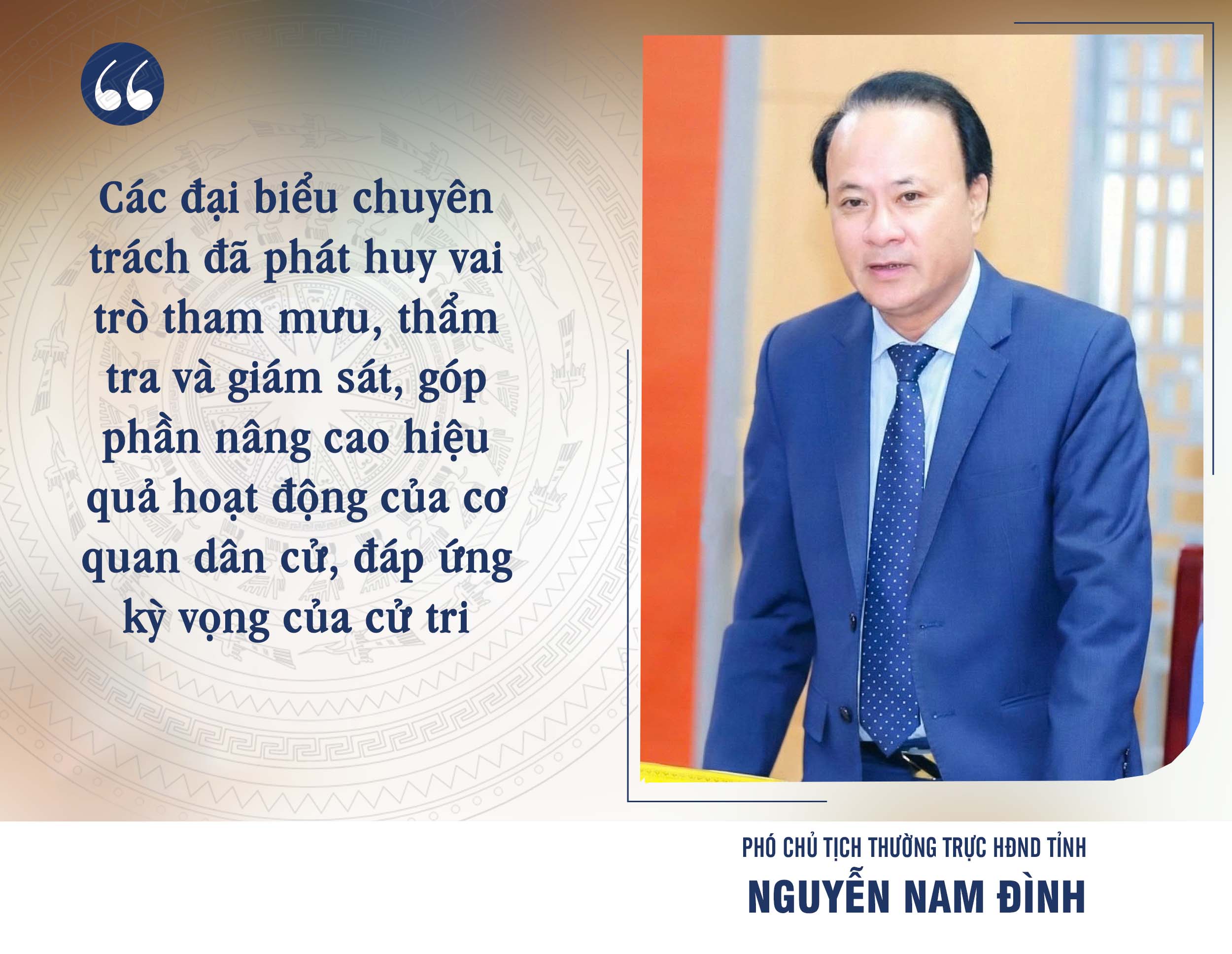 Đánh giá về hoạt động của đội ngũ đại biểu chuyên trách tại cơ quan dân cử tỉnh Nghệ An trong nhiệm kỳ vừa qua, đồng chí Nguyễn Nam Đình, Phó Chủ tịch Thường trực HĐND tỉnh nhấn mạnh: “Các đại biểu chuyên trách đã phát huy vai trò tham mưu, thẩm tra và giám sát, góp phần nâng cao hiệu quả hoạt động của cơ quan dân cử, đáp ứng kỳ vọng ngày càng cao của cử tri”.