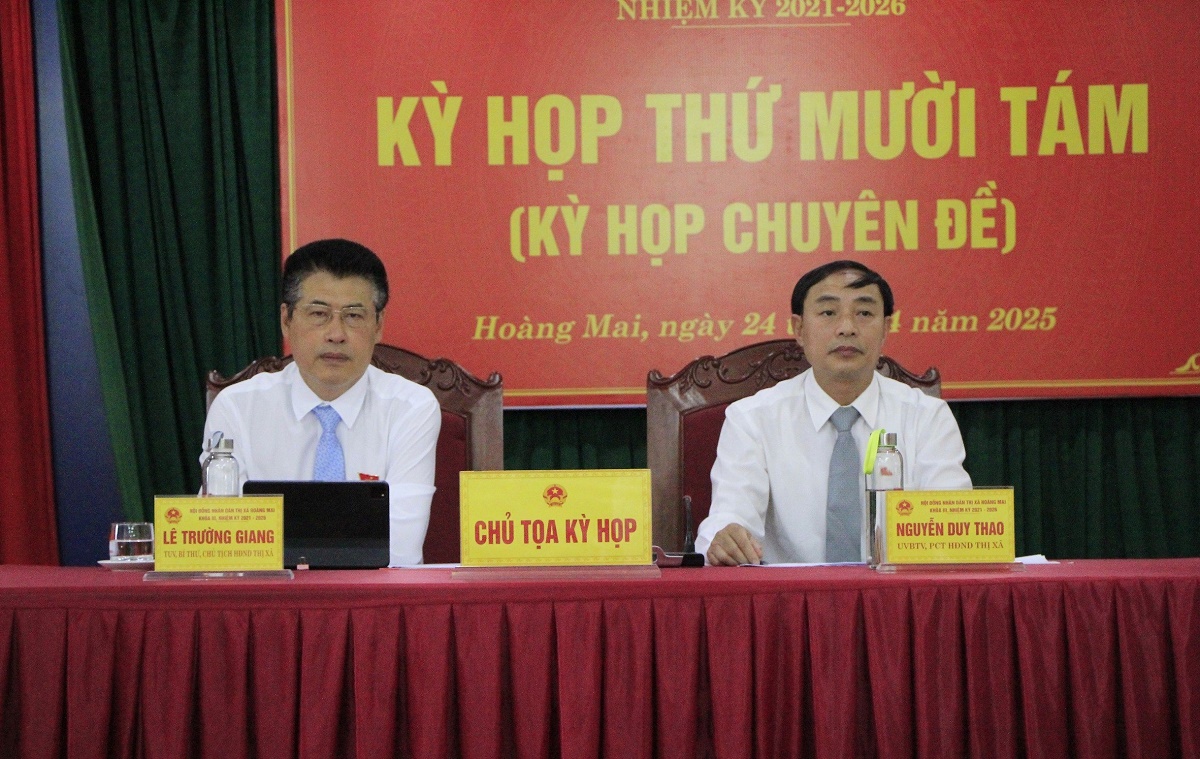 Kỳ họp đã thông qua dự thảo Nghị quyết về việc tán thành chủ trương sắp xếp đơn vị hành chính cấp xã trên địa bàn thị xã Hoàng Mai năm 2025, cụ thể: Phường Hoàng Mai 1 được thành lập trên cơ sở sáp nhập toàn bộ diện tích và dân số của xã Quỳnh Trang, xã Quỳnh Vinh và phường Quỳnh Thiện; Phường Hoàng Mai 2 sáp nhập các địa bàn xã Quỳnh Lộc, xã Quỳnh Lập và phường Quỳnh Dị; Phường Hoàng Mai 3 hợp nhất các xã Quỳnh Liên, phường Mai Hùng, phường Quỳnh Phương và phường Quỳnh Xuân.