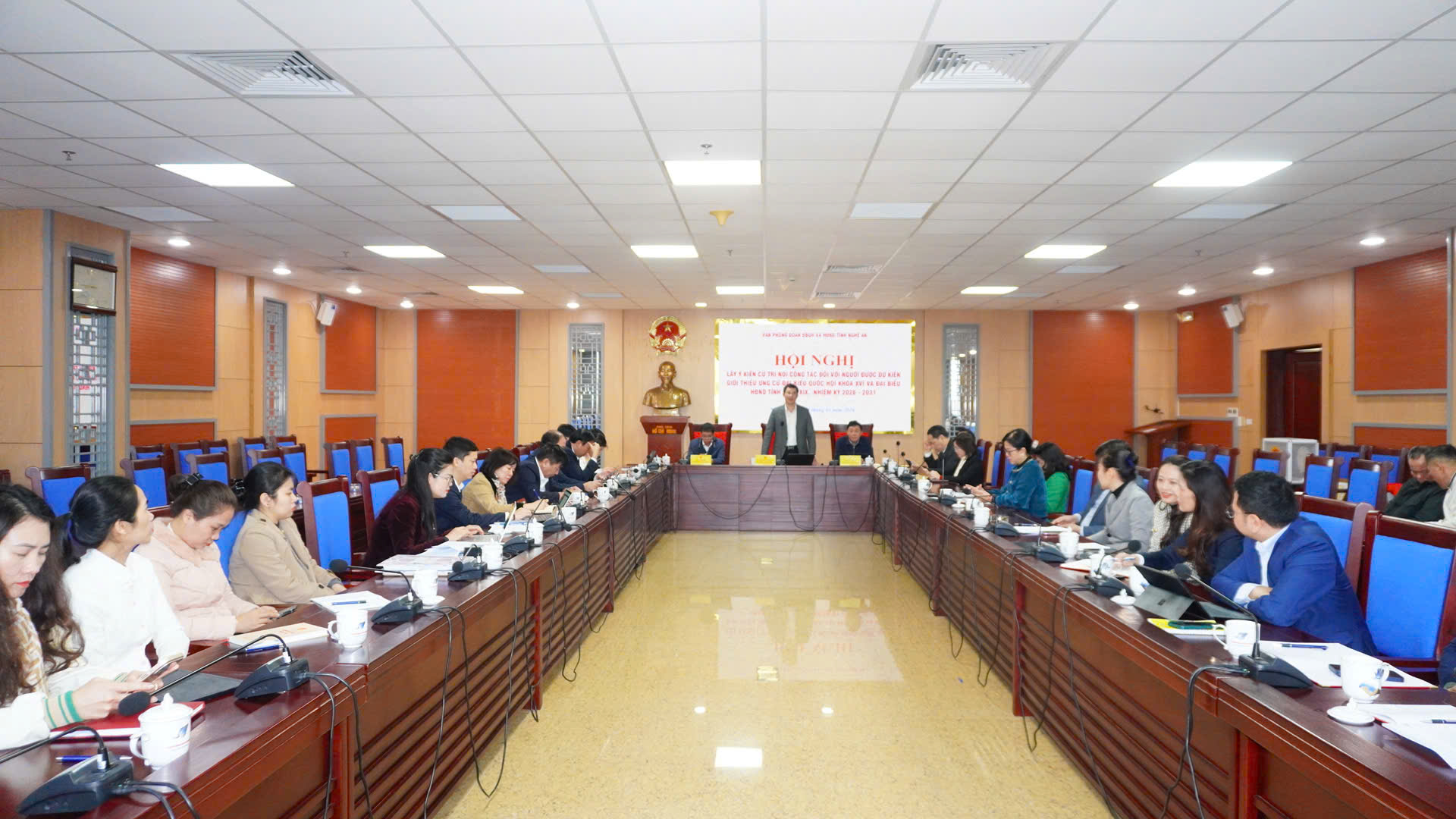 Đồng chí Nguyễn Thị Thu, Thư ký Hội nghị, trình bày danh sách dự kiến giới thiệu người ứng cử đại biểu Quốc hội khóa XVI và đại biểu HĐND tỉnh khóa XIX nhiệm kỳ 2026–2031. Theo phân bổ về cơ cấu, thành phần người ứng cử, Văn phòng Đoàn ĐBQH và HĐND tỉnh dự kiến giới thiệu 7 người ứng cử đại biểu Quốc hội khóa XVI; dự kiến giới thiệu 18 người ứng cử đại biểu HĐND tỉnh khóa XIX. Hội nghị cũng nghe tóm tắt tiểu sử của các cá nhân được dự kiến giới thiệu ứng cử.