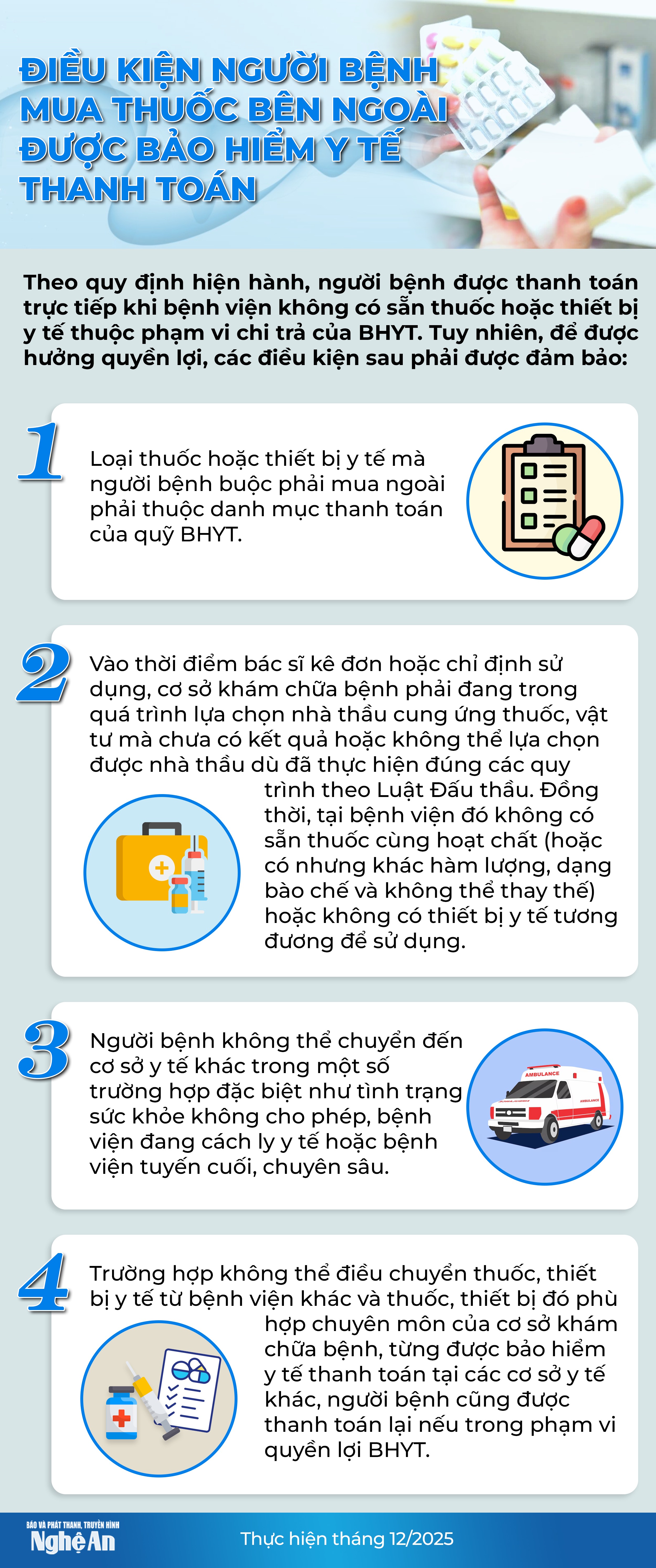 Infographic: Điều kiện người bệnh mua thuốc bên ngoài được Bảo hiểm y tế thanh toán