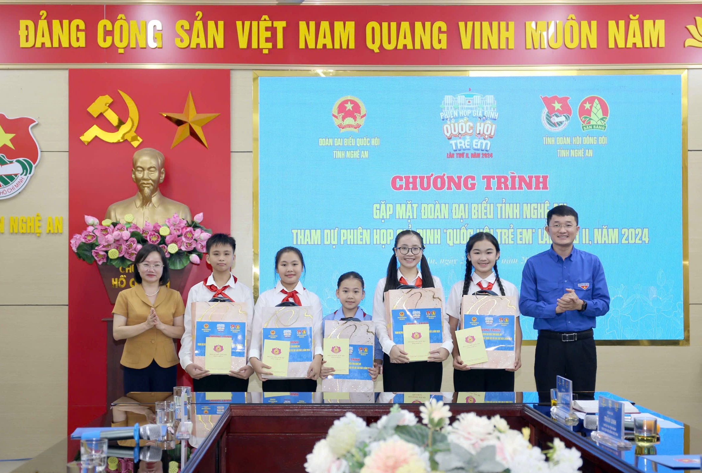Nhân dịp này, Đoàn đại biểu Quốc hội tỉnh, Tỉnh đoàn và Hội đồng Đội tỉnh đã dành tặng 06 đại biểu trẻ em những phần quà ý nghĩa nhằm động viên các em tự tin và có sự chuẩn bị tốt nhất để tham gia phiên họp giả định “Quốc hội trẻ em” lần thứ II, năm 2024.
