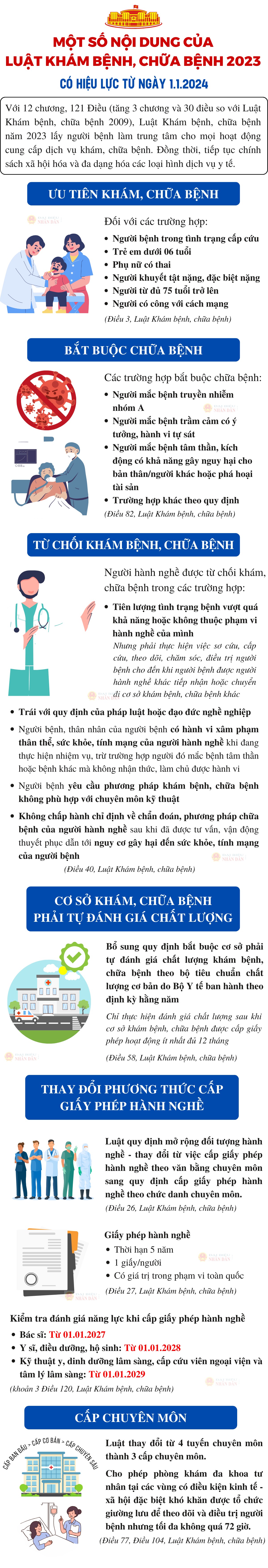 Luật Khám bệnh, chữa bệnh được Quốc hội thông qua ngày 9.1.2023, có hiệu lực thi hành kể từ ngày 1.1.2024. Với 12 chương, 121 Điều (tăng 3 chương và 30 điều so với Luật Khám bệnh, chữa bệnh 2009). Luật Khám bệnh, chữa bệnh năm 2023 lấy người bệnh làm trung tâm cho mọi hoạt động cung cấp dịch vụ khám, chữa bệnh. Đồng thời, tiếp tục chính sách xã hội hóa và đa dạng hóa các loại hình dịch vụ y tế.