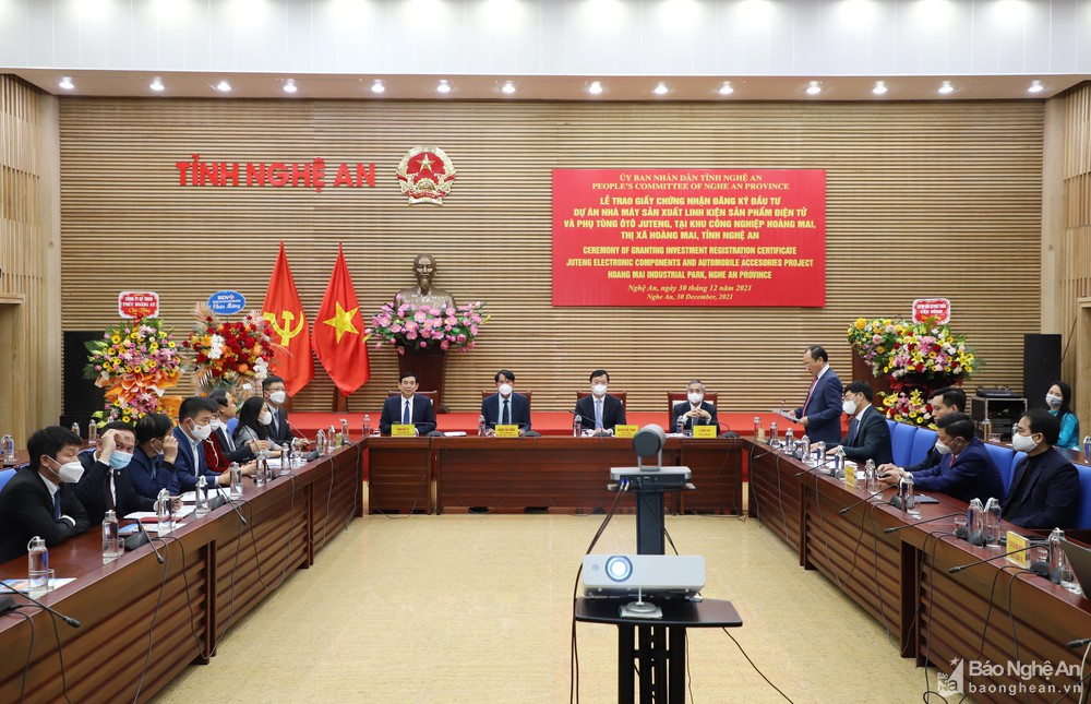 Tại buổi lễ đã diễn ra lễ ký kết Thỏa thuận nguyên tắc thuê lại đất và trao giấy chứng nhận đăng ký đầu tư dự án Nhà máy sản xuất linh kiện sản phẩm điện tử và phụ tùng ô tô Ju Teng tại KCN Hoàng Mai (thị xã Hoàng Mai).