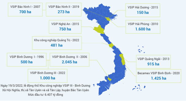 Đặt nền móng đầu tiên tại Việt Nam năm 1996 ở Bình Dương, đến nay VSIP là một trong những KCN thành công nhất tại Việt Nam. Sau hơn 25 năm tạo dựng và phát triển, VSIP đã thực hiện 11 dự án lớn với quy mô 10.000 ha đất, thu hút nguồn vốn 17 tỷ USD từ 880 công ty đa quốc gia, hợp tác với 880 khách hàng đến từ 30 quốc gia, vùng lãnh thổ, giải quyết việc làm cho hơn 295.000 nhân công lao động.